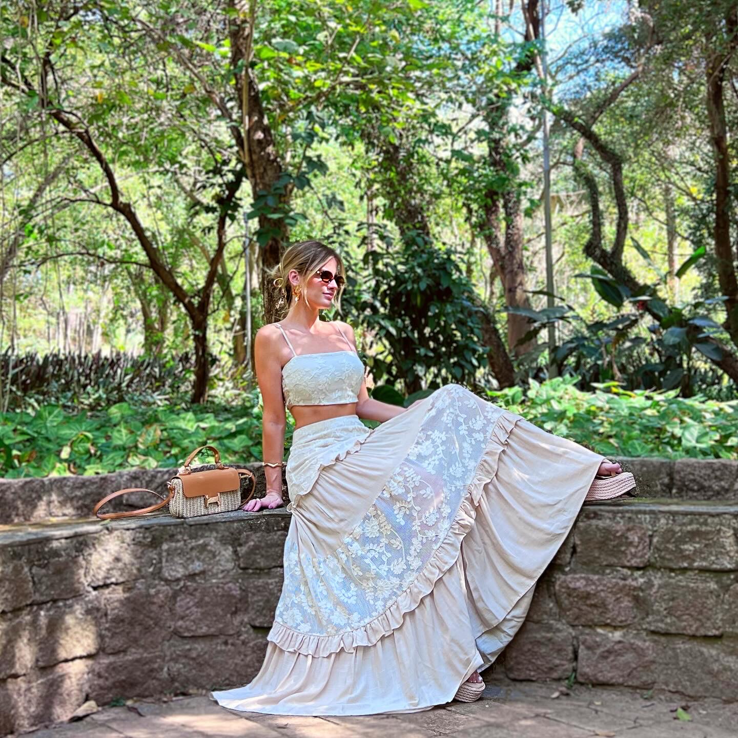 A saia em camadas proporciona movimento e fluidez, enquanto o top delicado valoriza a silhueta com charme atemporal.