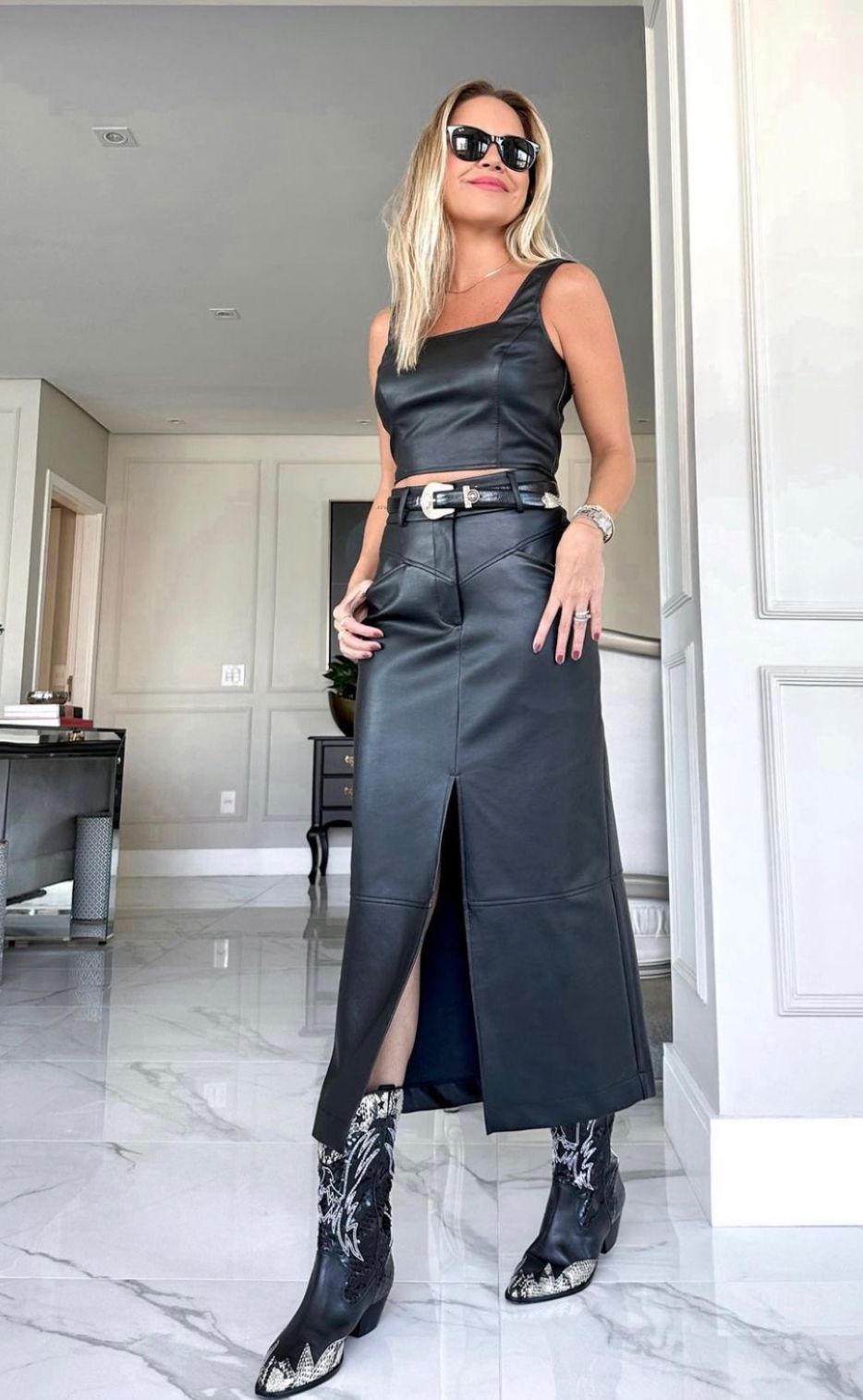 Saia de couro midi alongada com fenda frontal, botão e zíper, bolsos faca e caimento deslumbrante! Use com botas, tênis, saltos, camisas, regatas e arrase!