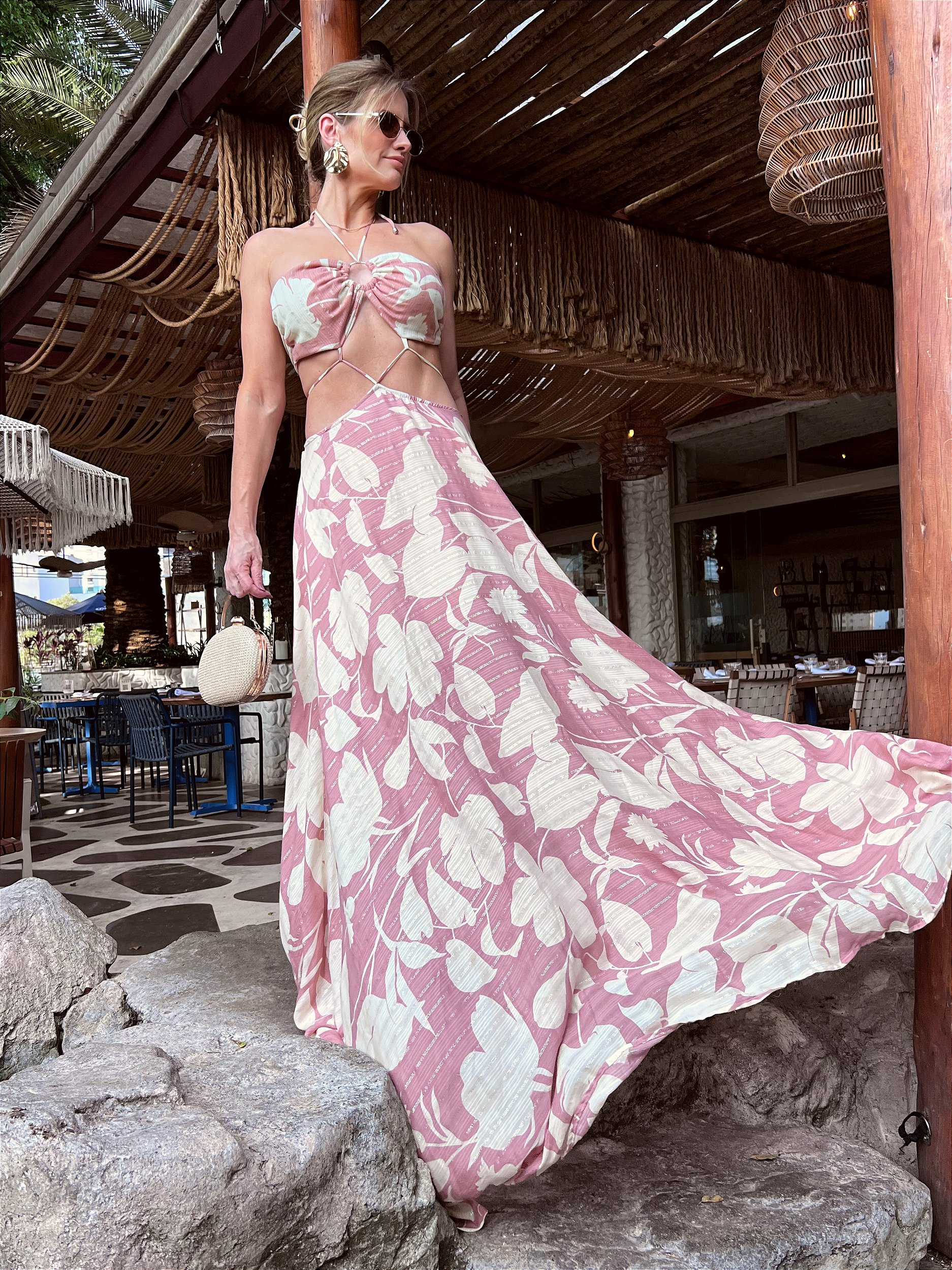 Descrição: Vestido longo forrado, confeccionado em viscose fluida e leve, com fios de lurex que adicionam brilho sutil e charme à peça. Possui zíper na parte de trás da saia e amarração no colo, cintura e costas, proporcionando caimento perfeito.